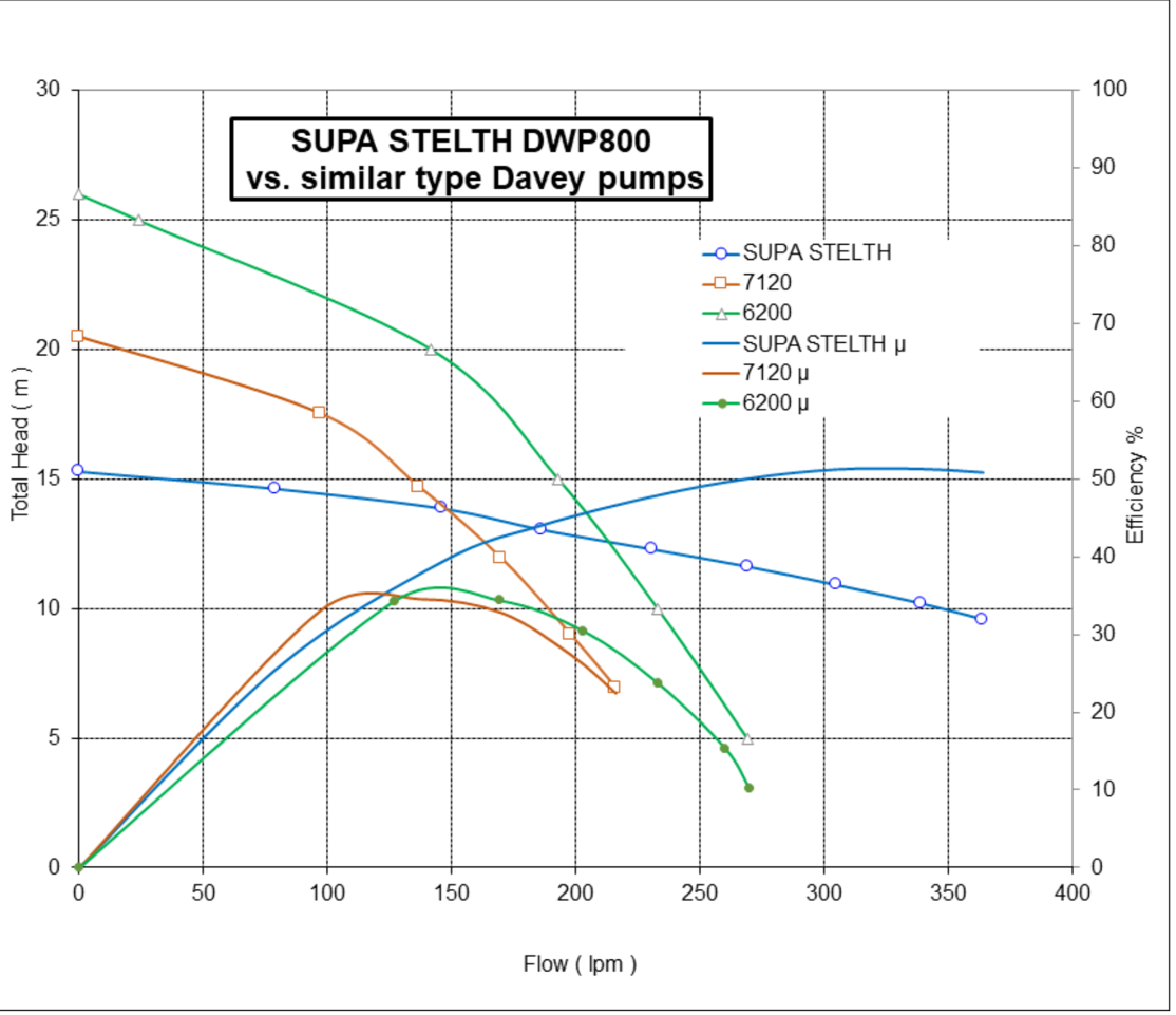 We have tested our 800 watt pump with independent test facilities in China, Germany and Australia and compared the results to one of the industry leaders. Here are the results in graphical form.